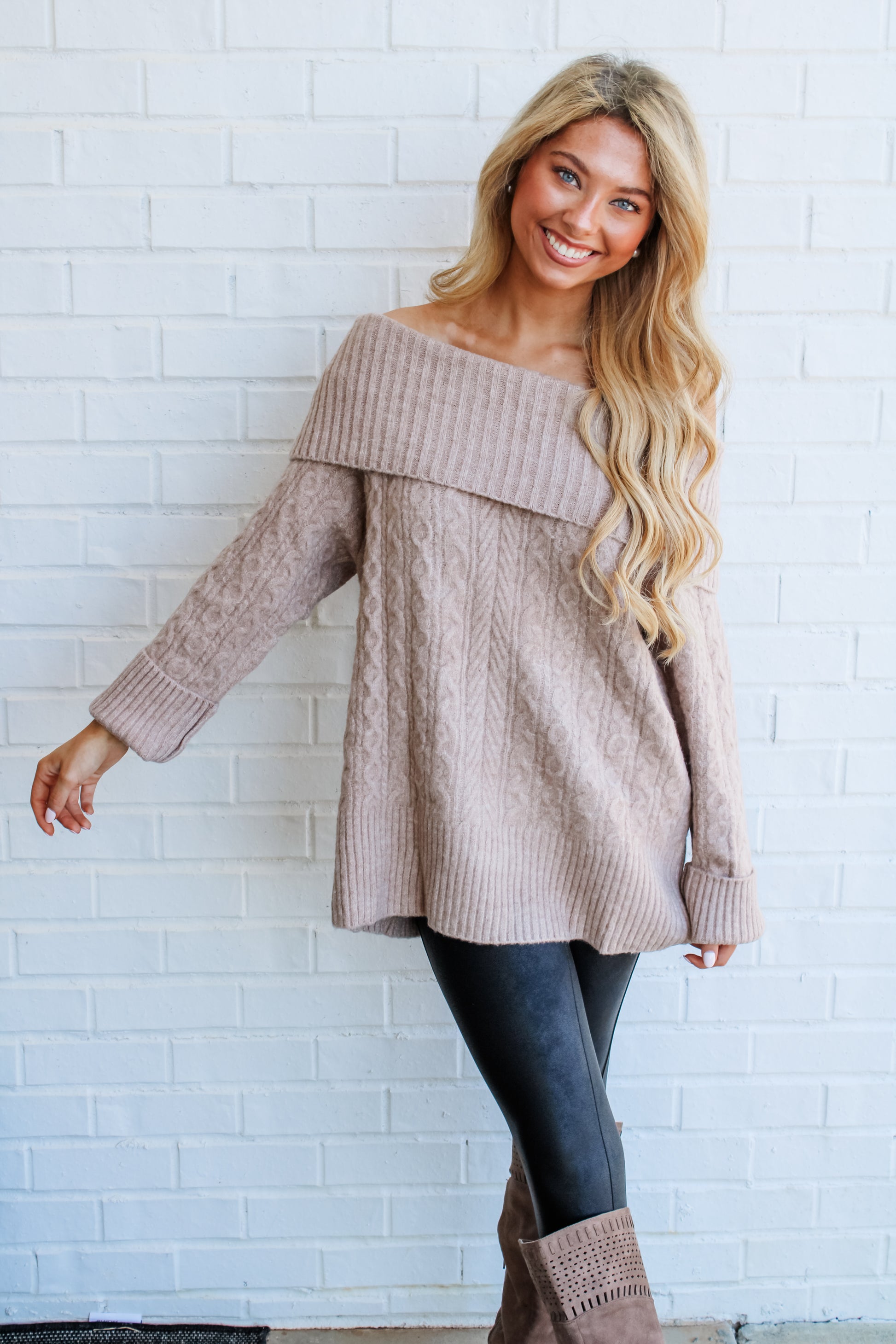 - A mocha toned knit sweater with an off the shoulder overlay and an oversized fit.